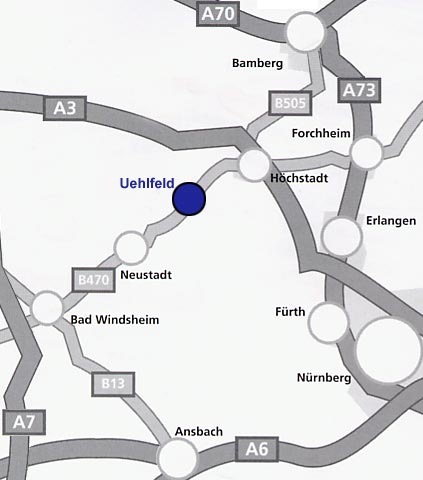 Nach dem Ortseingang die erste Abfahrt rechts in den Aischtalweg einbiegen. Dem Aischtalweg mit der Linkskurve am Feuwerwehrhaus folgen. An der nächsten Kreuzung (Am Schleifweg/ Aischtalweg) geradeaus in die Ernst-Hombach Straße fahren. Nach wenigen Metern folgt rechts die Einfahrt in die Ludwig-Erhard-Straße. Der Weg zu TSO ist mit einem Schild markiert.